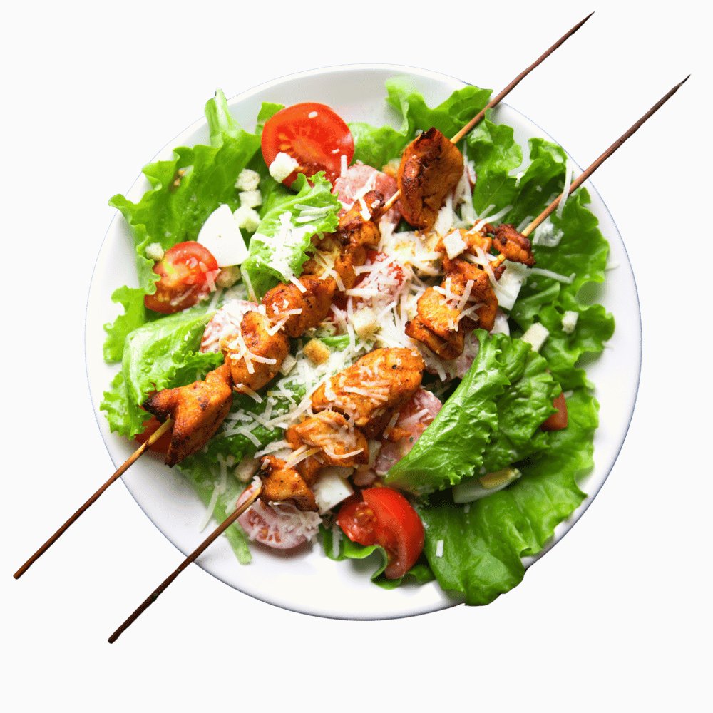gemischter Salat mit Tomaten, Gurken, Karotten, mariniertem Hähnchenspieß und Fetakäse