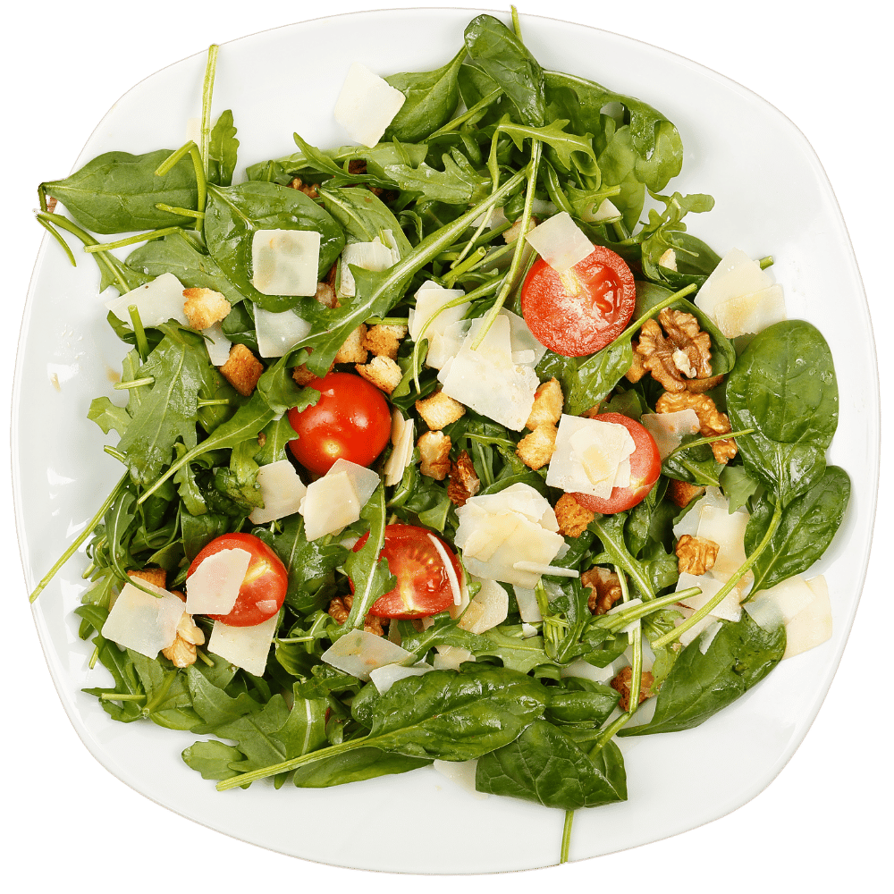 gemischter Salat mit Tomaten, Gurken, paniertem Schnitzelfleisch, gebratenen Champignons und Knoblauch