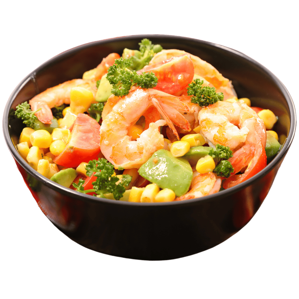 gemischter Salat mit Tomaten, Gurken und 6 Gambas (Shrimps im Kartoffelmantel)