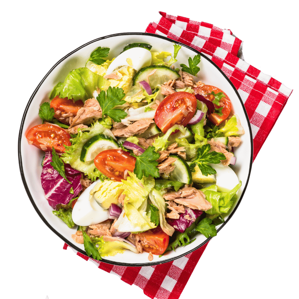 gemischter Salat mit Tomaten, Gurken, Thunfisch, Zwiebeln, Artischocken, Sardellen, Eiern und Paprika