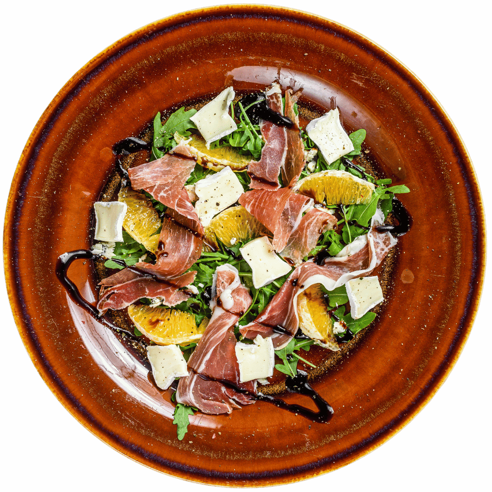 gemischter Salat mit Tomaten, Gurken, Parmaschinken, Parmesankäse, Mozzarella und Balsamico
